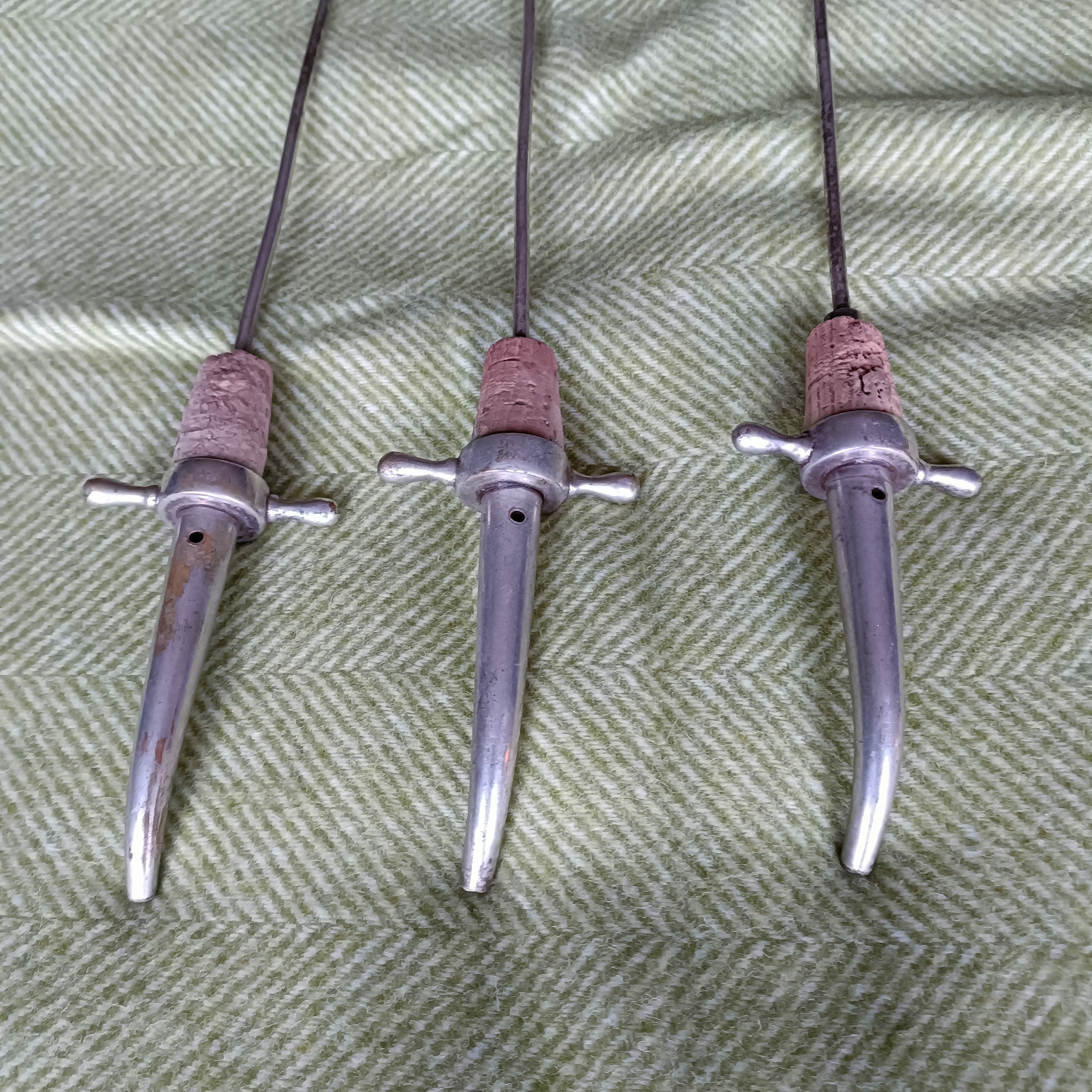 Measures just the pourers 9cm and total length 39.5 cm. 3 X Vintage Church Communion Wine Stoppers.Silver coloured Plated. Very unusual Postage within the UK