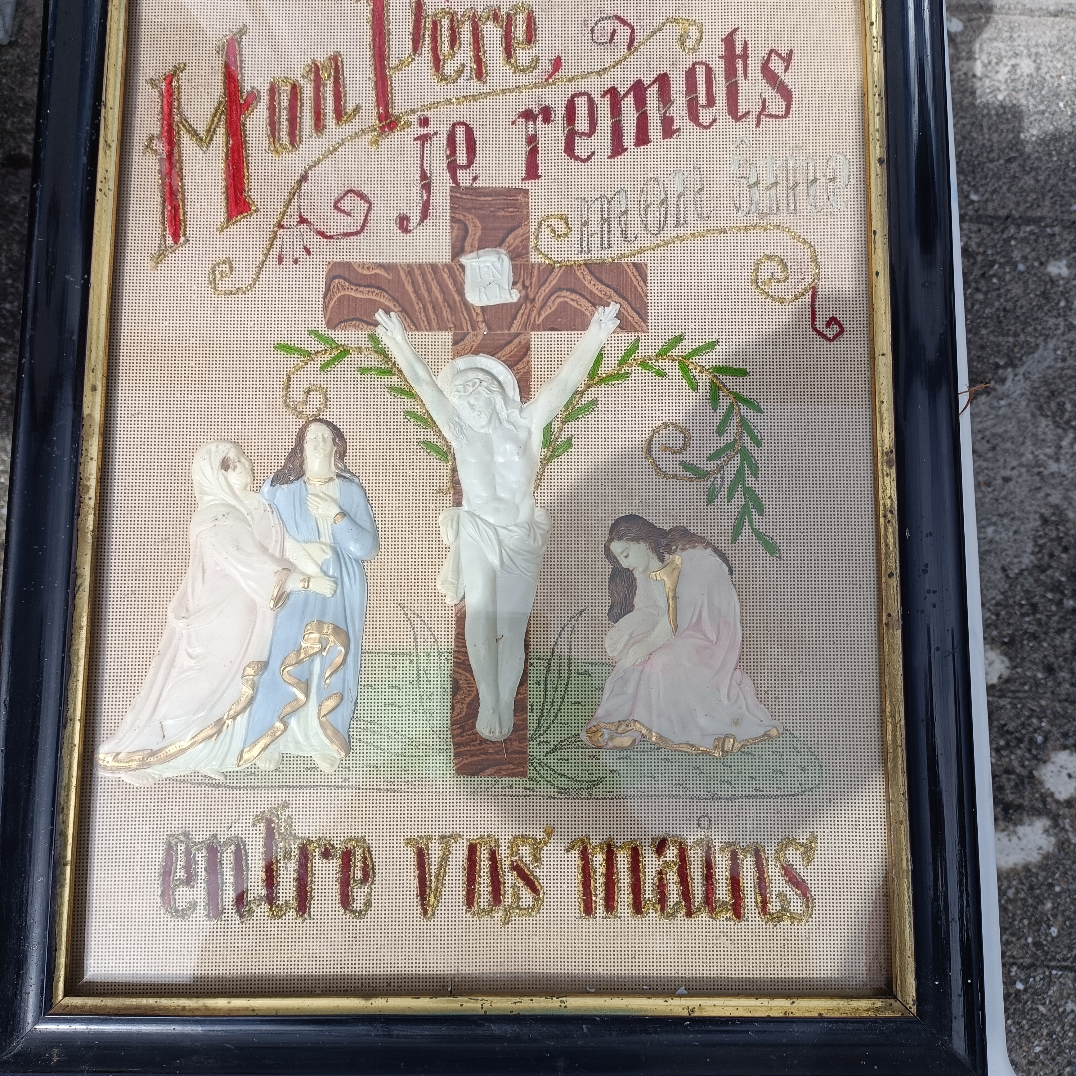 Measures 13.5 ins x 18 ins. It says ” My father I place my soul in your hands
