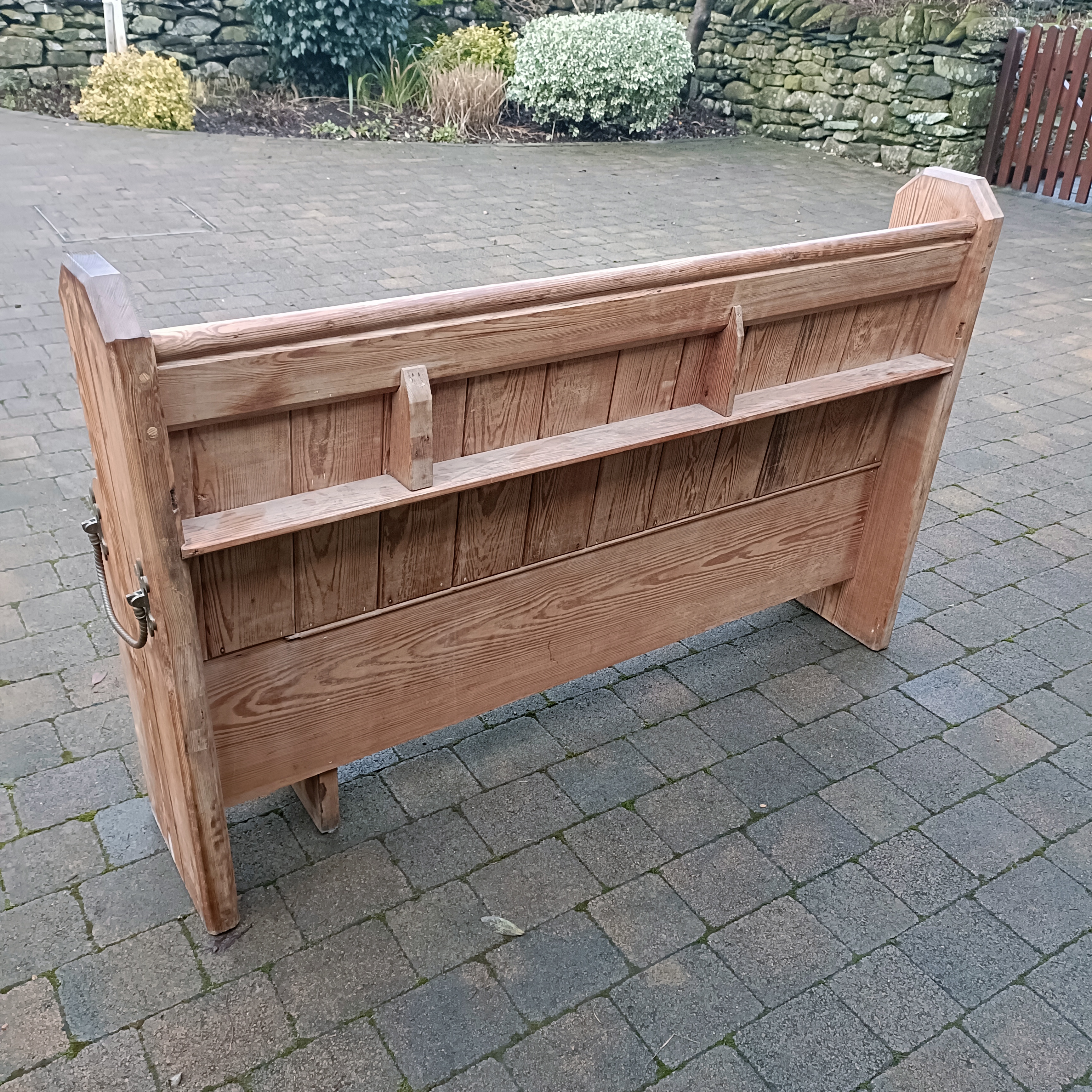 / Pitch Pine Church Pew. C 1880. Original Brass Unbrella Handles.